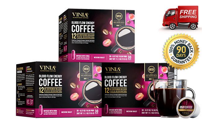 Enjoy the same blood flow boosting benefits of our capsules with our new VINIA Superfood Coffee! Our great tasting medium roast coffee is available in regular or decaf K-cup® pods.